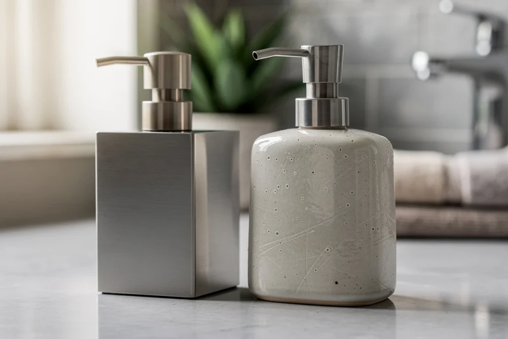 Côté design, le choix varie selon le mode de fixation : un distributeur mural s’intègre discrètement, tandis qu’un modèle à poser offre souvent plus de liberté esthétique. L’impact écologique entre aussi en jeu, car la possibilité d’utiliser des recharges limite considérablement les déchets par rapport aux flacons individuels.