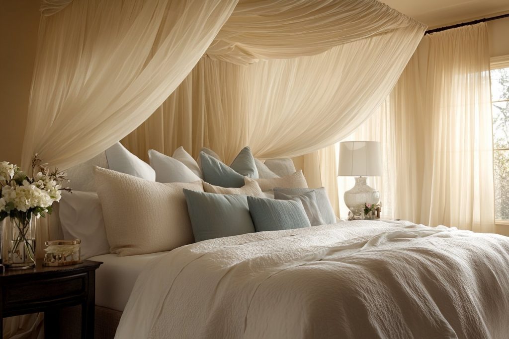 Un autre attrait de le ciel de lit est sa capacité à évoluer avec les saisons. En été, choisissez des couleurs claires et des matières légères pour une sensation de fraîcheur. Au contraire, en hiver, des coloris chauds et des textures douces comme le velours ajouteront du confort et de la chaleur.